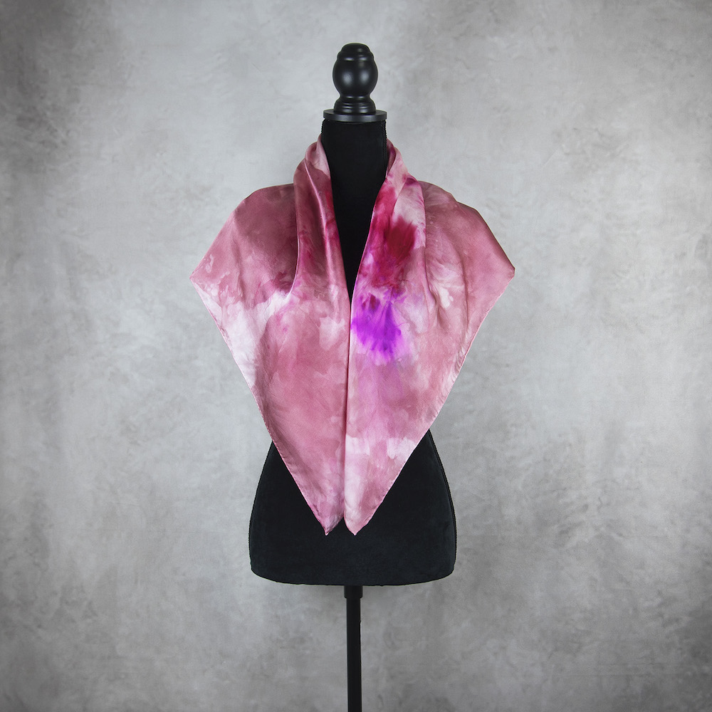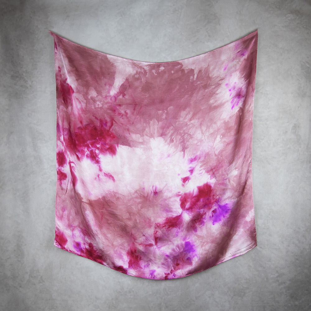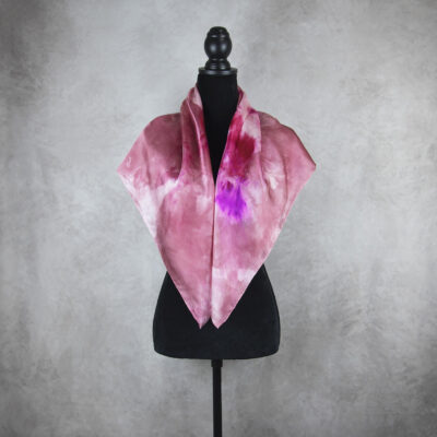 Postup tvorby: Šatka je farbená špeciálnym spôsobom, 100% prírodným pigmentom určeným priamo na farbenie hodvábu. Farba je zafixovaná, šatka vypratá a ošetrená fixátorom farieb. Okraje sú ručne zrolované a ručne prešité a následne je celá šatka vyžehlená.