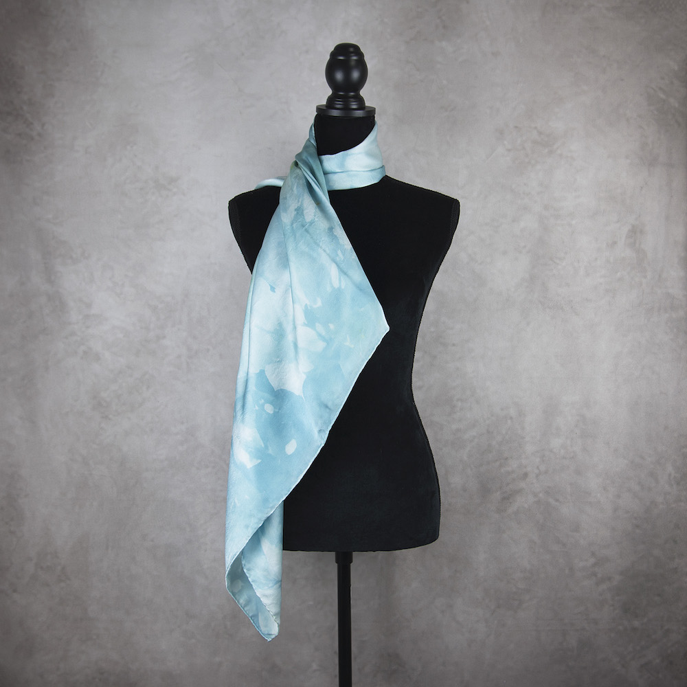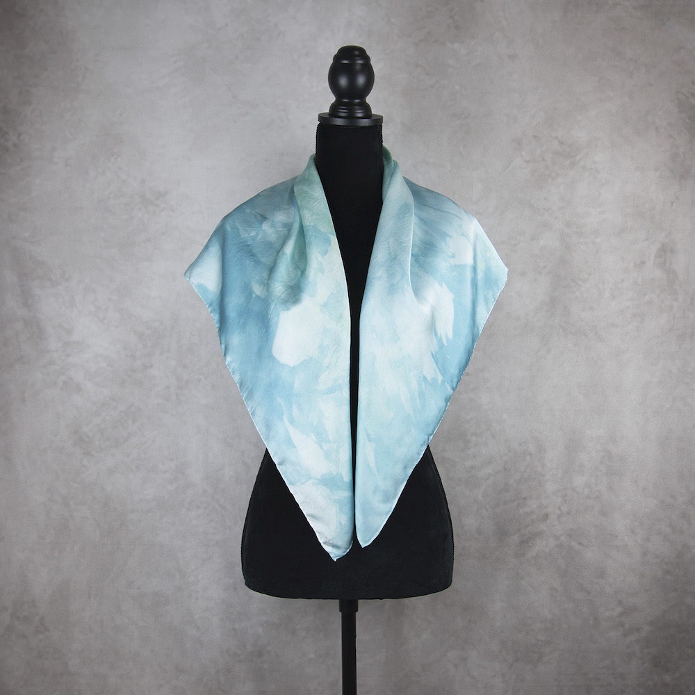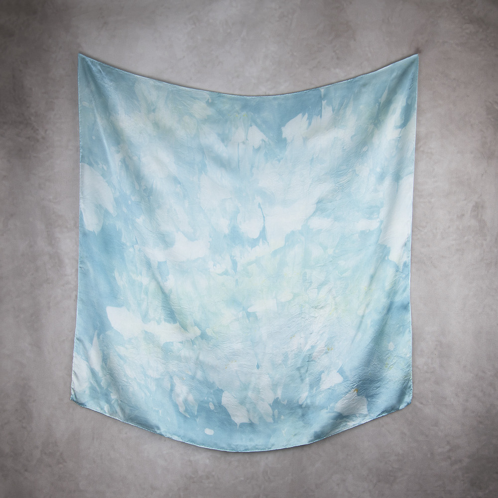Postup tvorby: Šatka je farbená špeciálnym spôsobom, 100% prírodným pigmentom určeným priamo na farbenie hodvábu. Farba je zafixovaná, šatka vypratá a ošetrená fixátorom farieb. Okraje sú ručne zrolované a ručne prešité a následne je celá šatka vyžehlená.