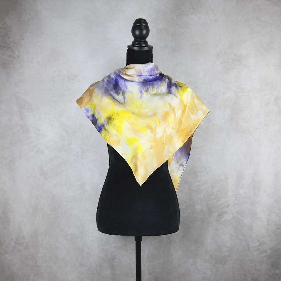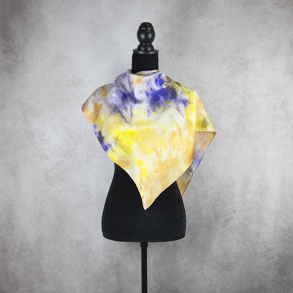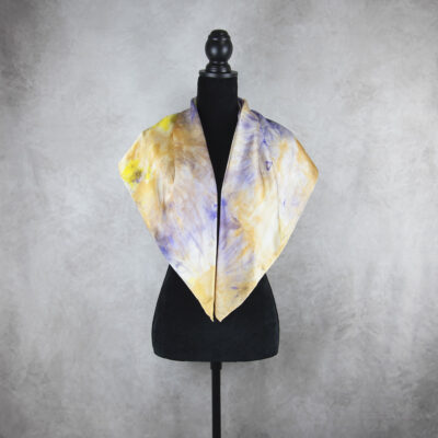 Postup tvorby: Šatka je farbená špeciálnym spôsobom, 100% prírodným pigmentom určeným priamo na farbenie hodvábu. Farba je zafixovaná, šatka vypratá a ošetrená fixátorom farieb. Okraje sú ručne zrolované a ručne prešité a následne je celá šatka vyžehlená.