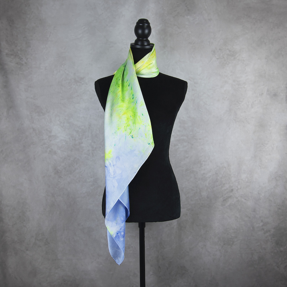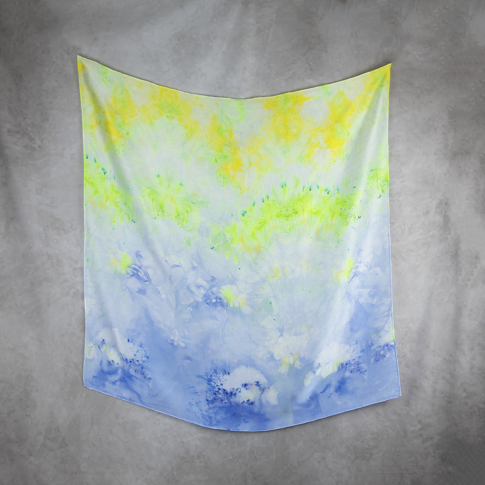 Postup tvorby: Šatka je farbená špeciálnym spôsobom, 100% prírodným pigmentom určeným priamo na farbenie hodvábu. Farba je zafixovaná, šatka vypratá a ošetrená fixátorom farieb. Okraje sú ručne zrolované a ručne prešité a následne je celá šatka vyžehlená.