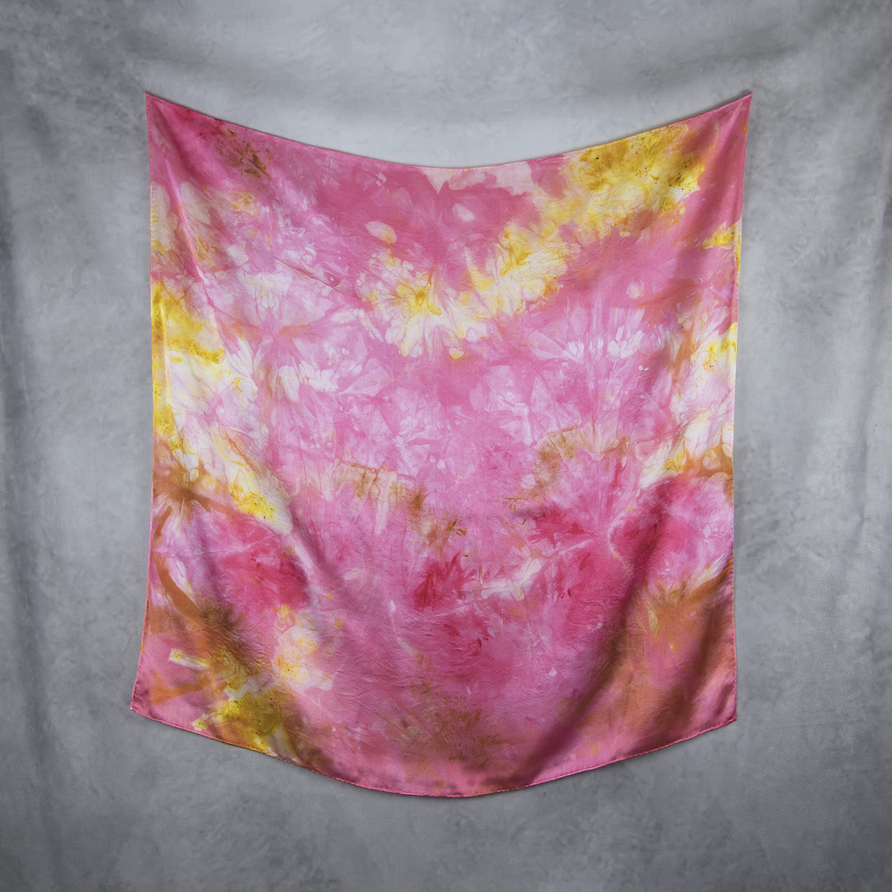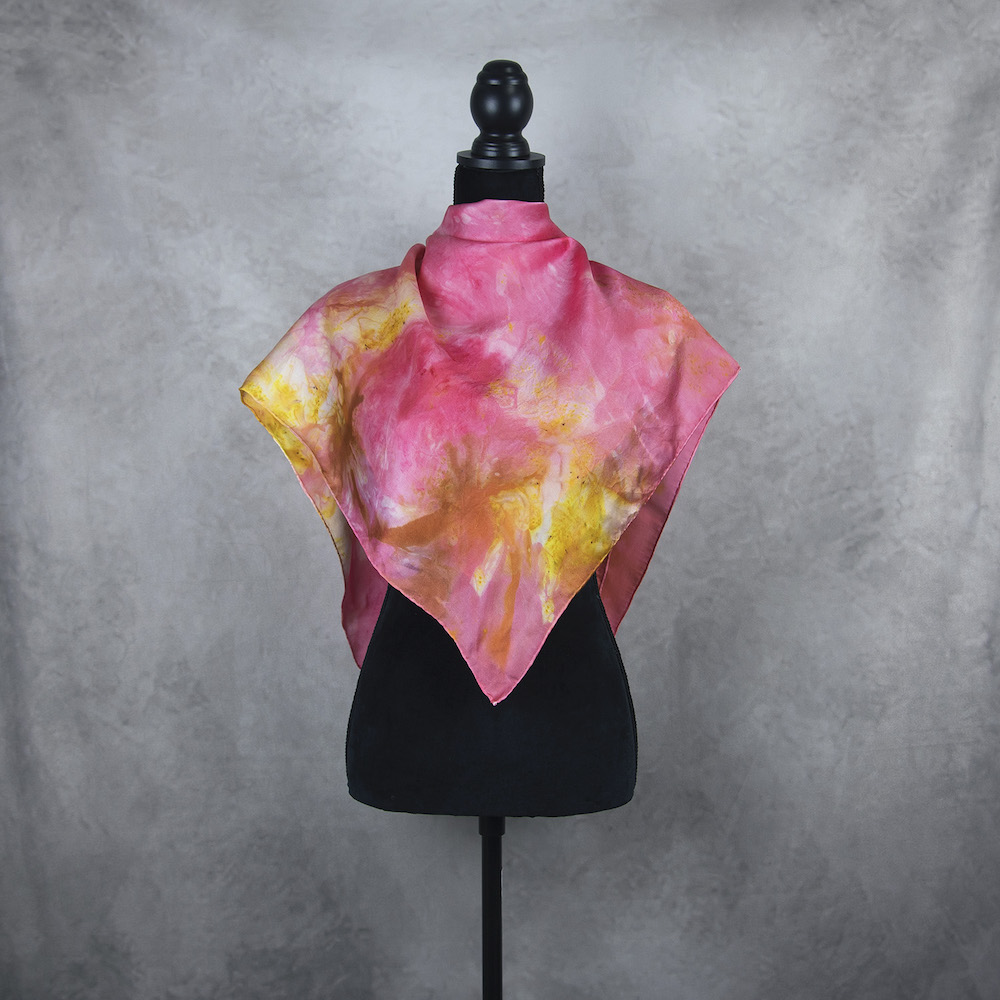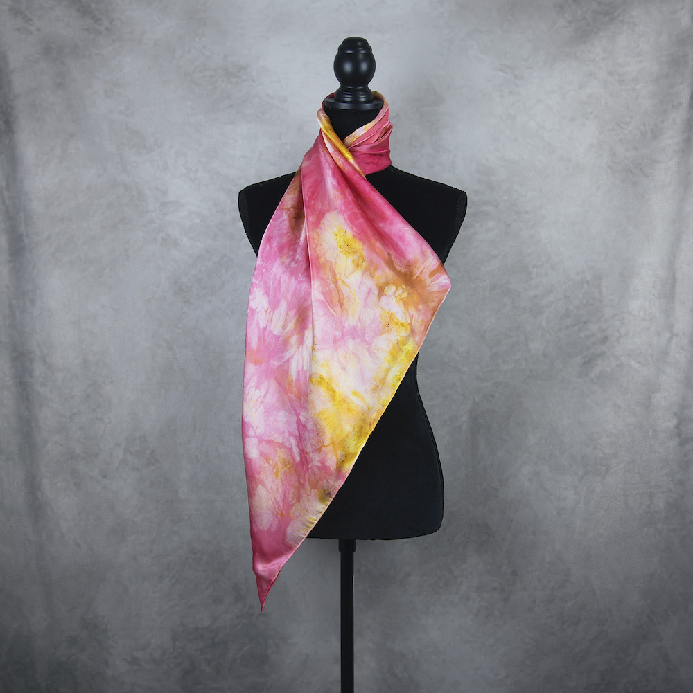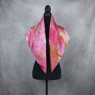 Postup tvorby: Šatka je farbená špeciálnym spôsobom, 100% prírodným pigmentom určeným priamo na farbenie hodvábu. Farba je zafixovaná, šatka vypratá a ošetrená fixátorom farieb. Okraje sú ručne zrolované a ručne prešité a následne je celá šatka vyžehlená.