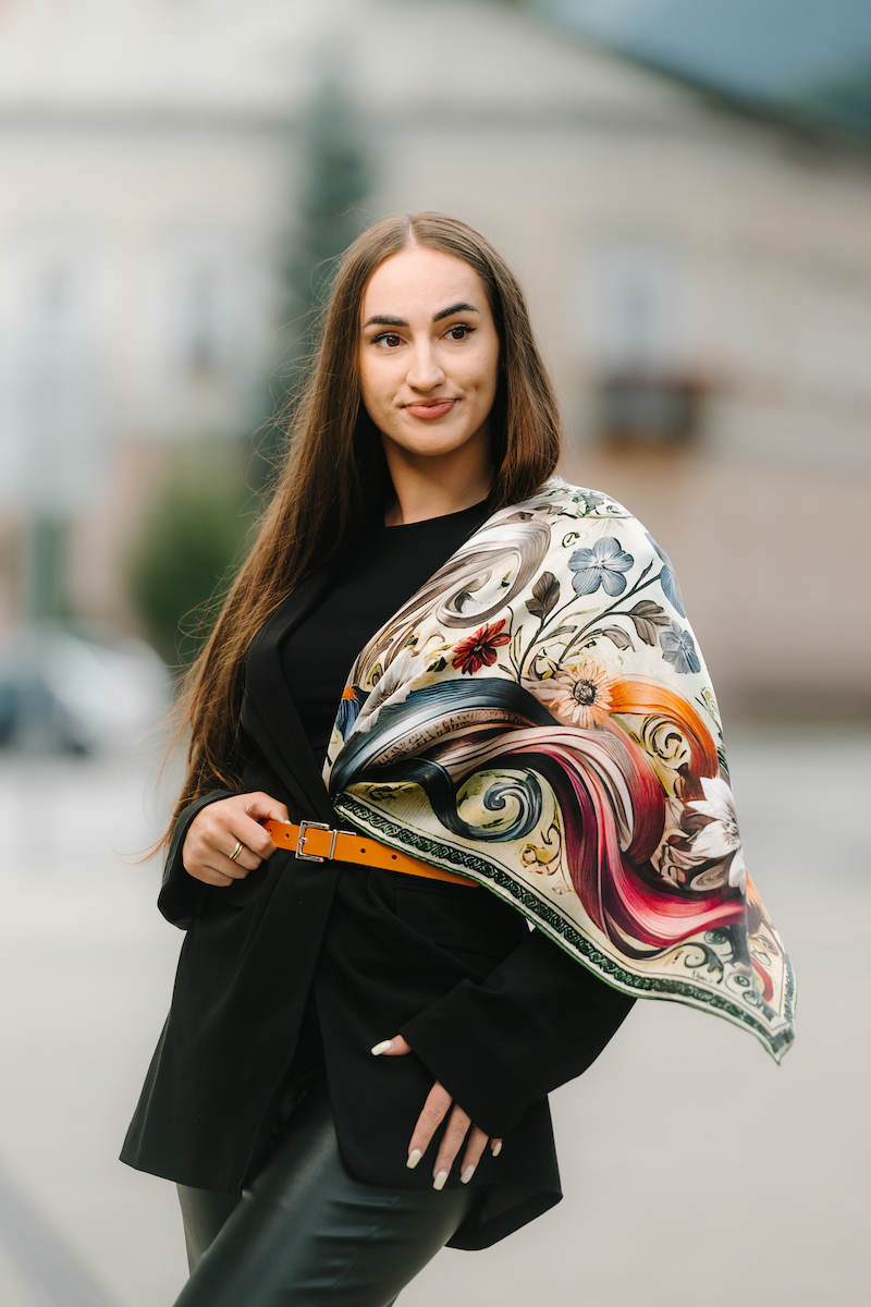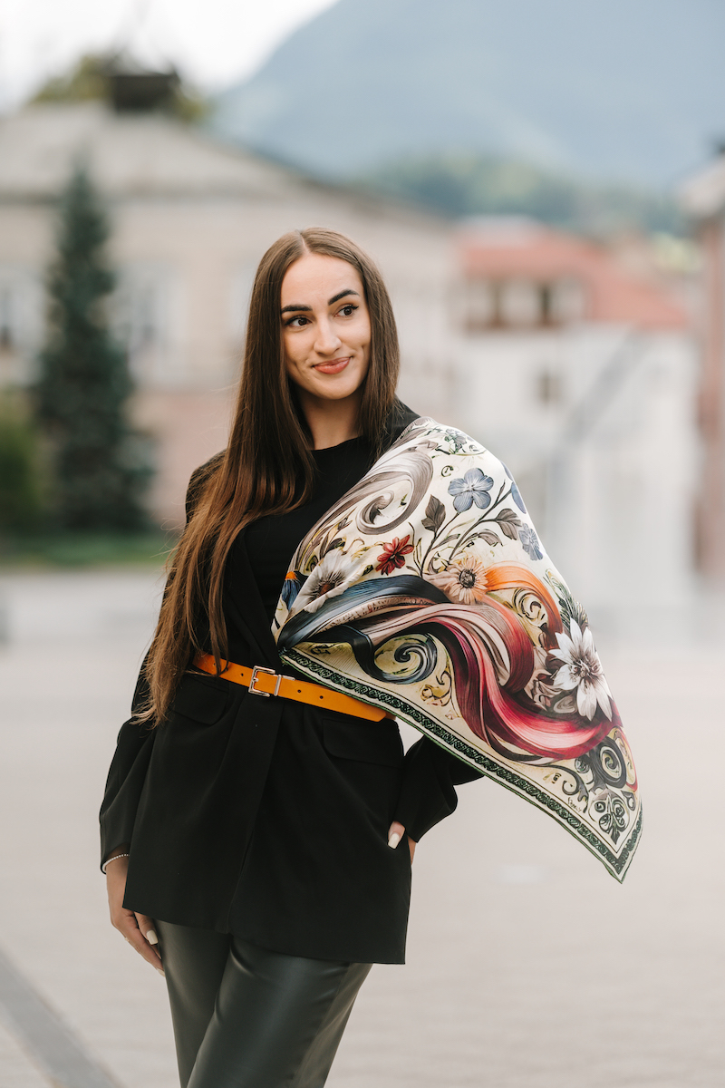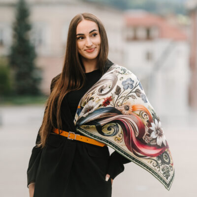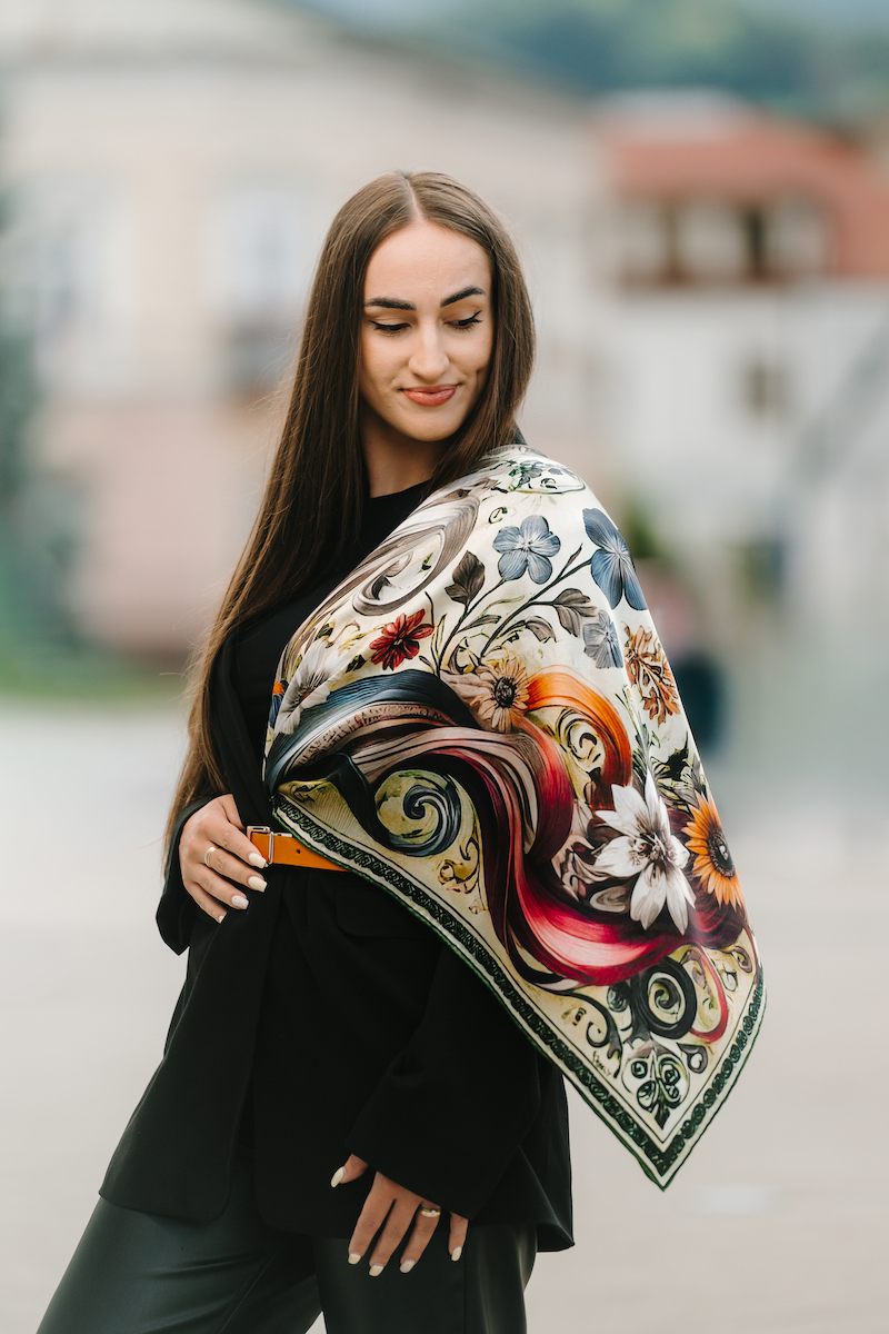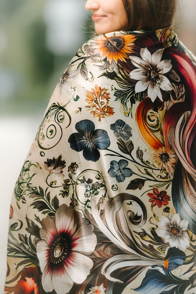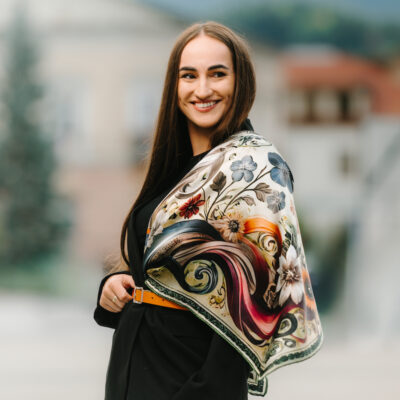 Hodvábne šatky s digitálnou potlačou sú stelesnením luxusu a štýlu, ktoré dodávajú outfitu pocit elegancie. Sú vyrobené z prírodného luxusného hodvábu typu CREPE SATEN , ktorý sa používa na výrobu našich šatiek s kvetinovými, zvieracími, abstraktnými a Slovenskými vzormi. Všetky naše kúsky hrdo vyrába firma VegaLM na Slovensku priamo v Liptovskom Mikuláši. Každá fáza, od výberu hodvábu až po remeselnú povrchovú úpravu, sa vykonáva s maximálnou starostlivosťou, aby sa zaručila dokonalosť
