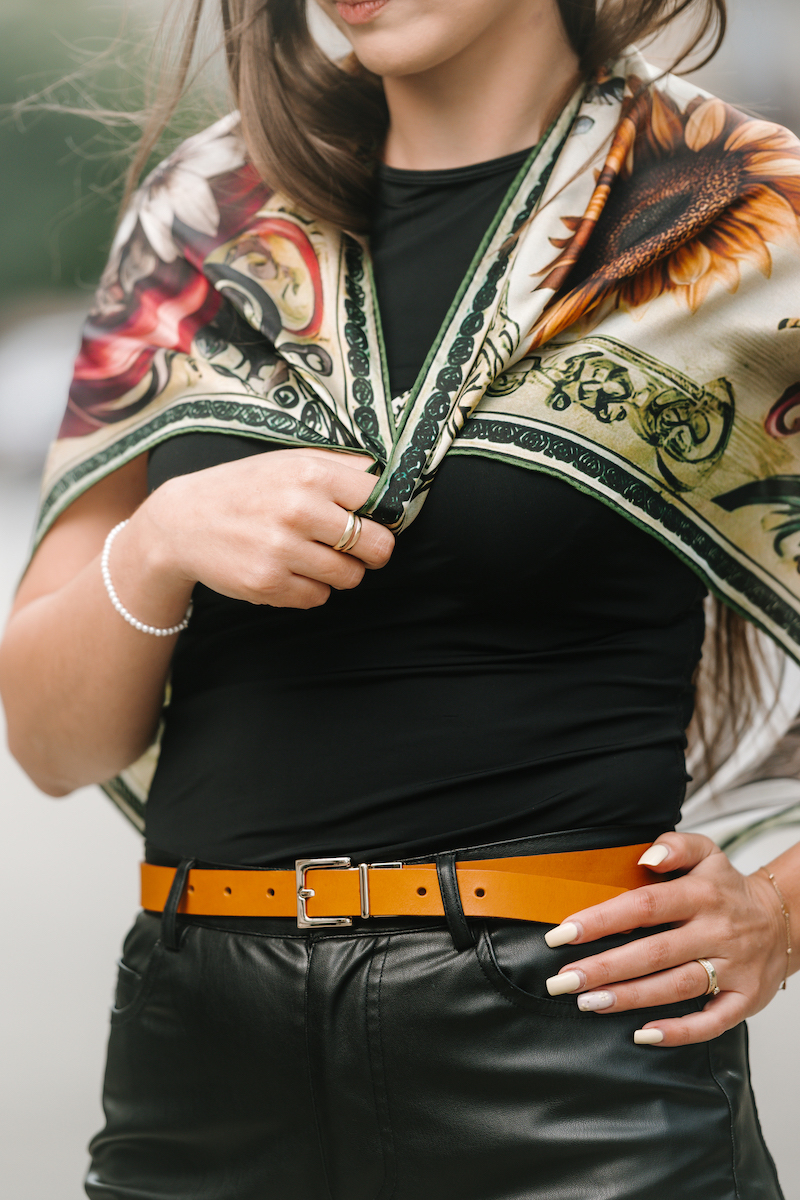 -klasická šatka okolo krku – vďaka vlastnostiam hodvábu je vhodné nosenie celoročne