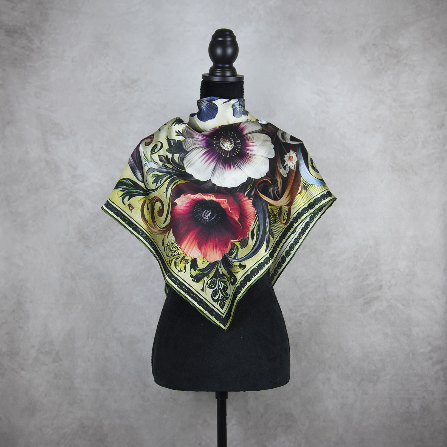 Hodvábna šatka LÚČNE KVETY – ZELENÉ, 90 x 90cm, Vyrobené na Slovensku