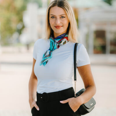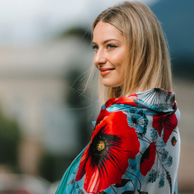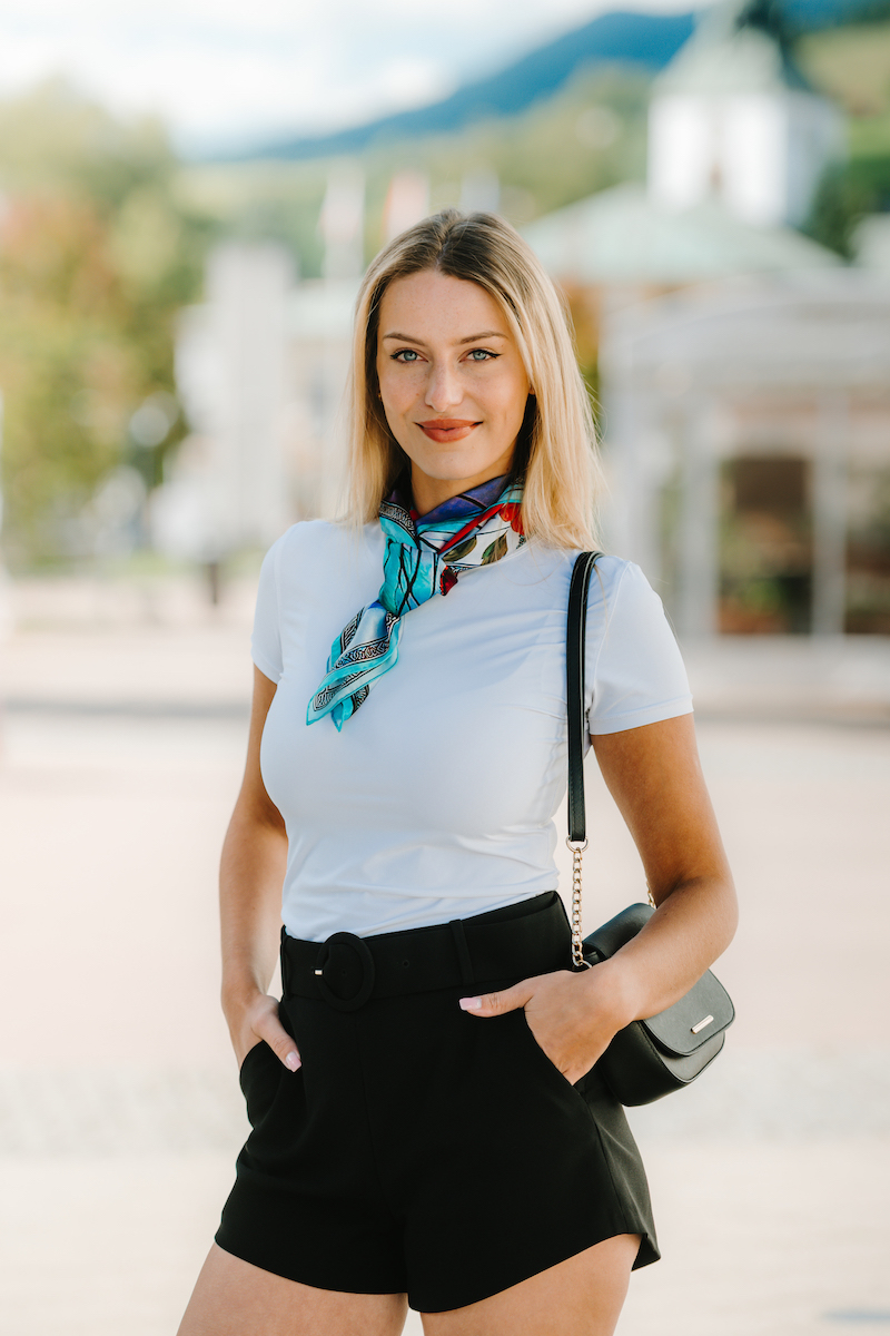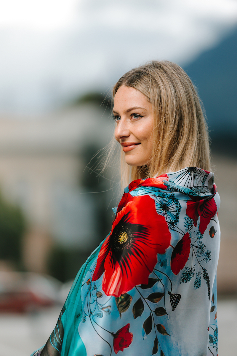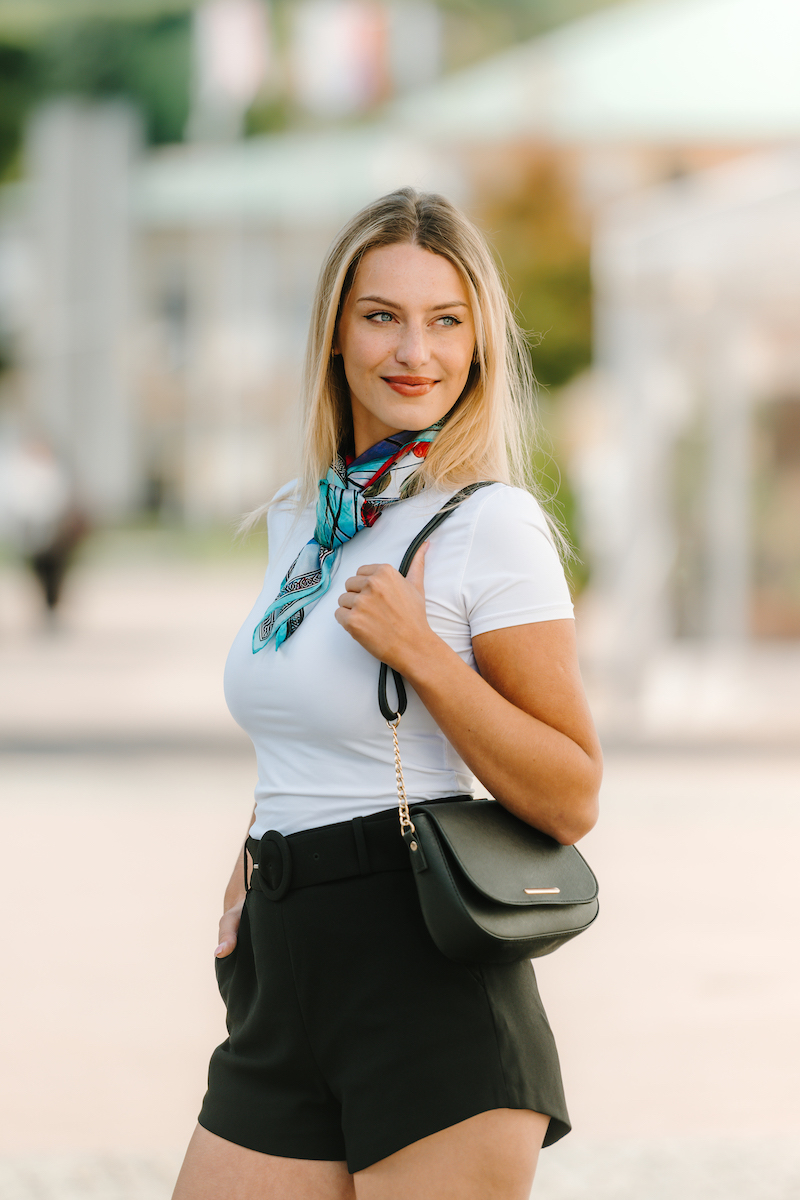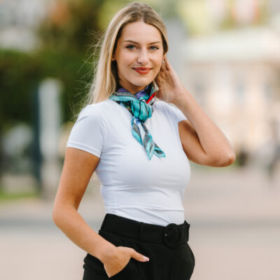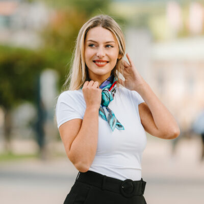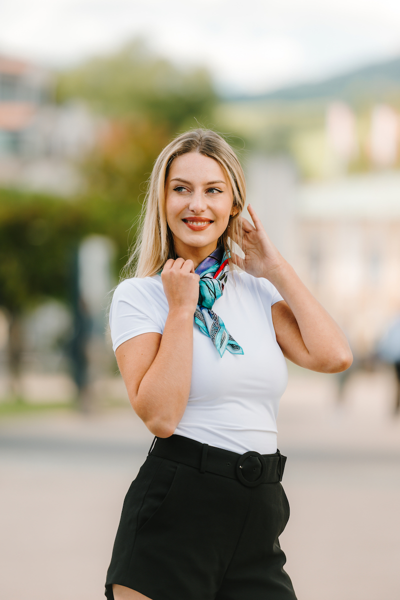-klasická šatka okolo krku – vďaka vlastnostiam hodvábu je vhodné nosenie celoročne