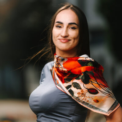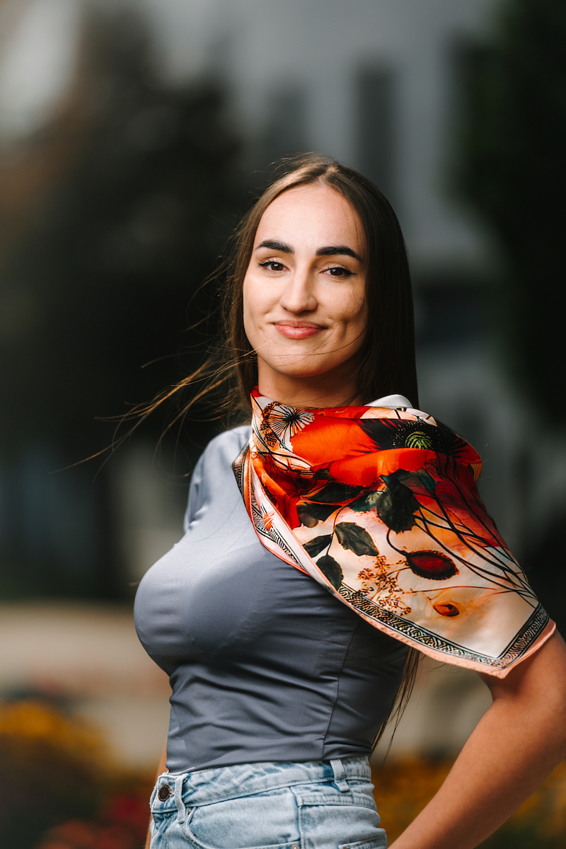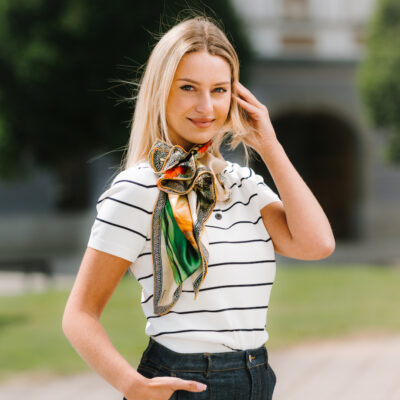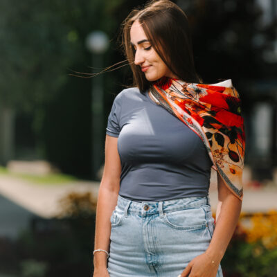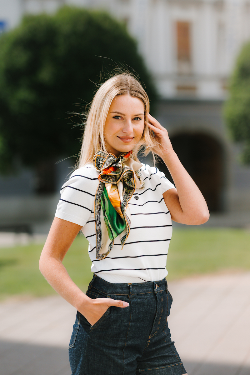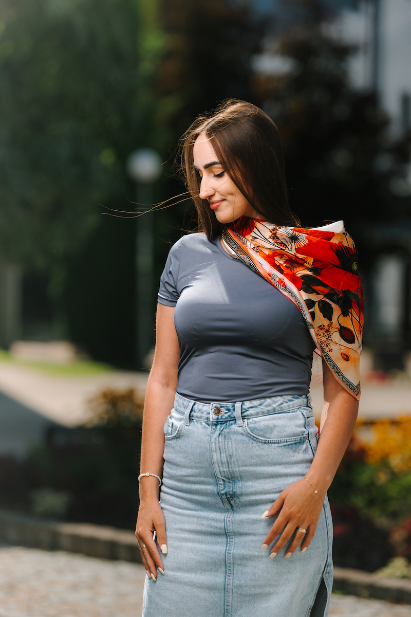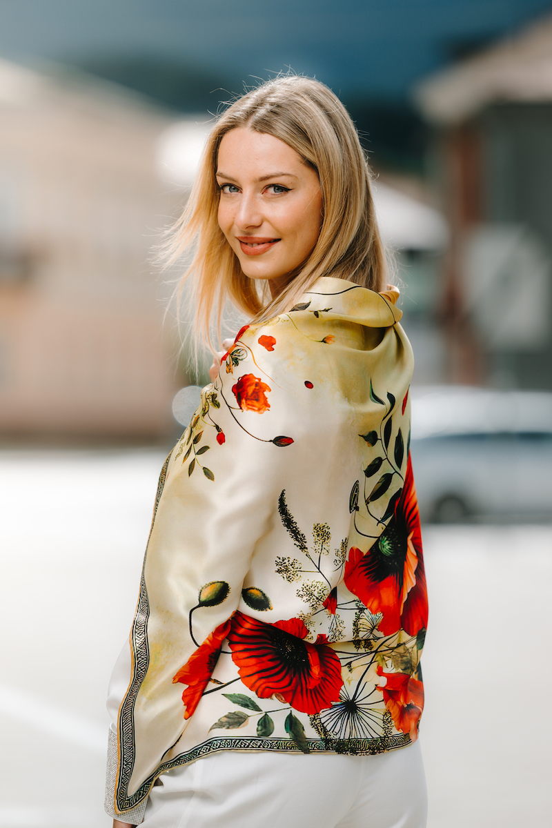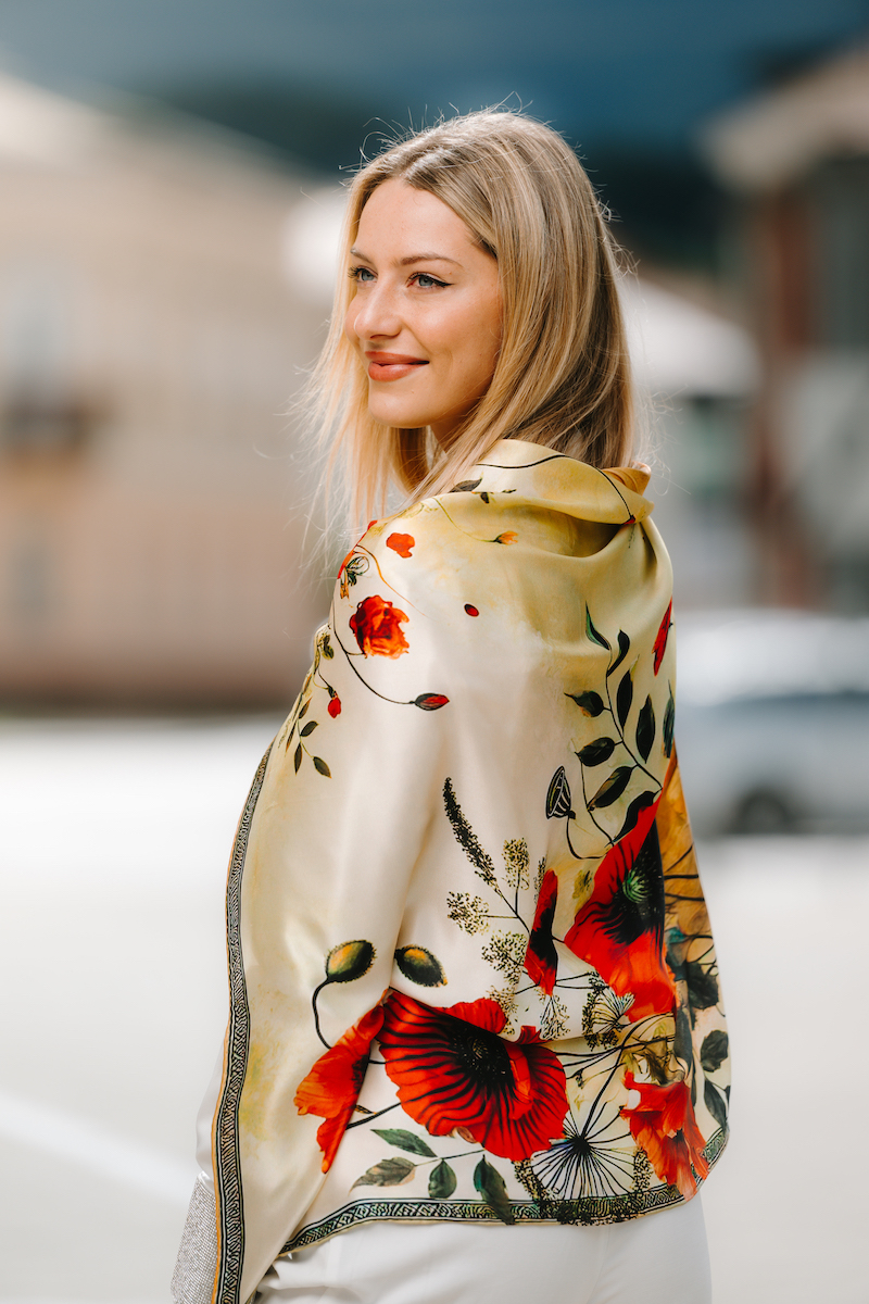 -klasická šatka okolo krku – vďaka vlastnostiam hodvábu je vhodné nosenie celoročne
