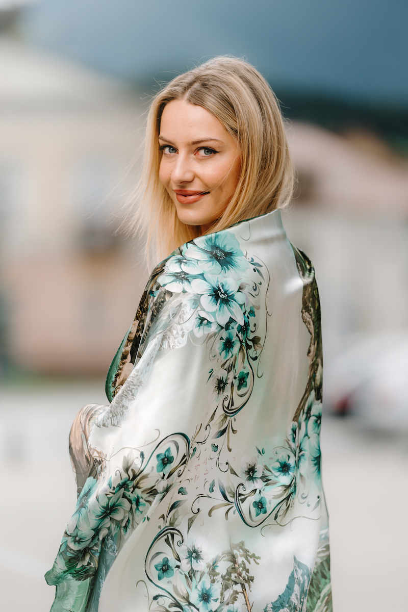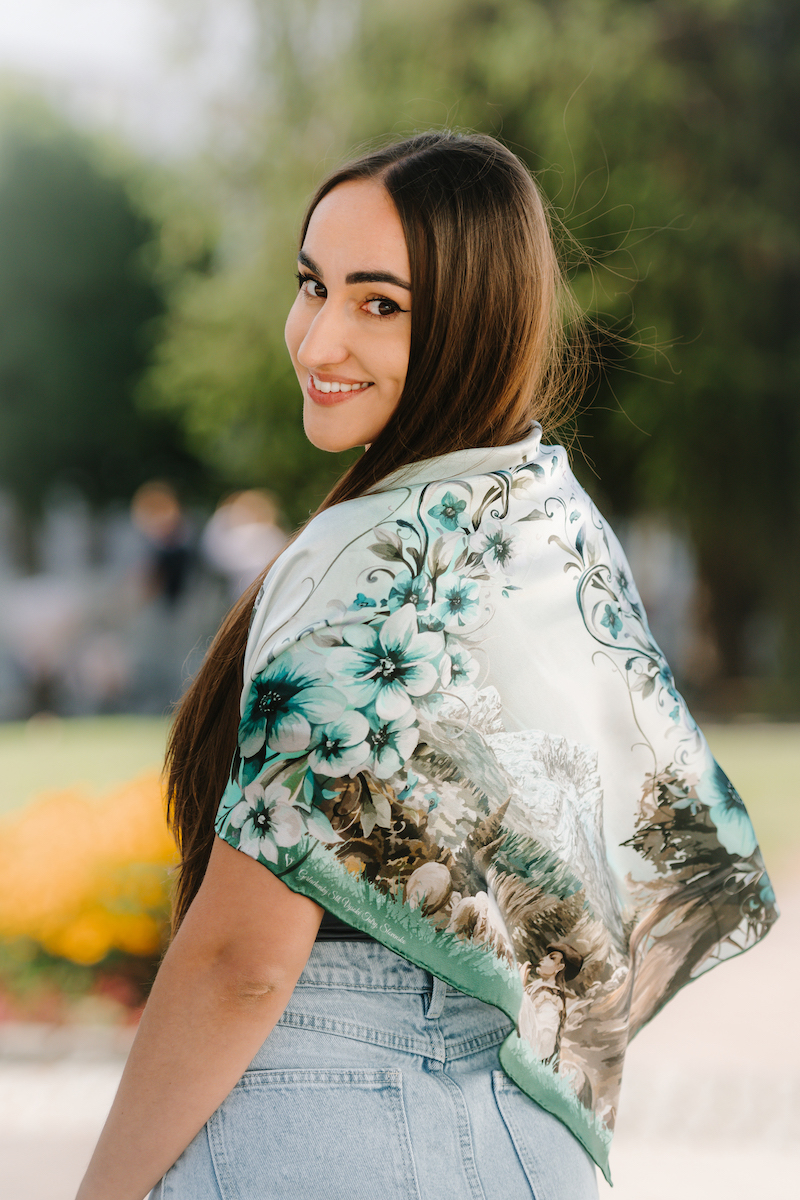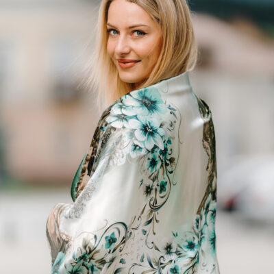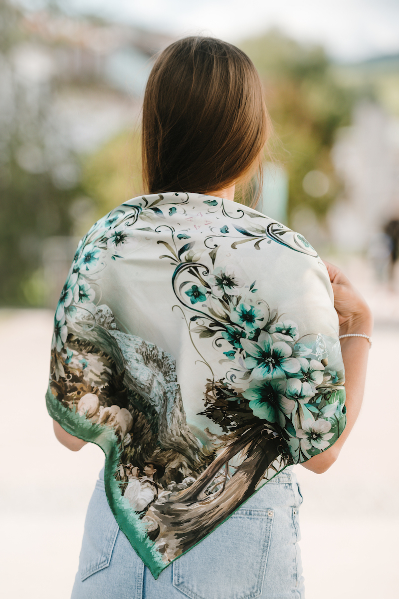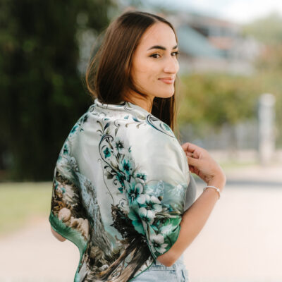 Hodvábne šatky s digitálnou potlačou sú stelesnením luxusu a štýlu, ktoré dodávajú outfitu pocit elegancie. Sú vyrobené z prírodného luxusného hodvábu typu CREPE SATEN , ktorý sa používa na výrobu našich šatiek s kvetinovými, zvieracími, abstraktnými a Slovenskými vzormi. Všetky naše kúsky hrdo vyrába firma VegaLM na Slovensku priamo v Liptovskom Mikuláši. Každá fáza, od výberu hodvábu až po remeselnú povrchovú úpravu, sa vykonáva s maximálnou starostlivosťou, aby sa zaručila dokonalosť