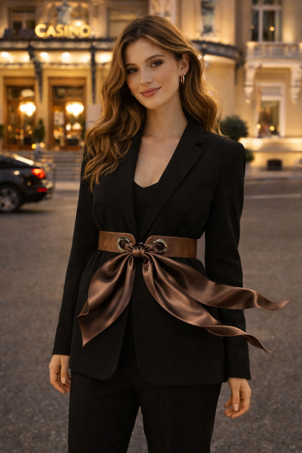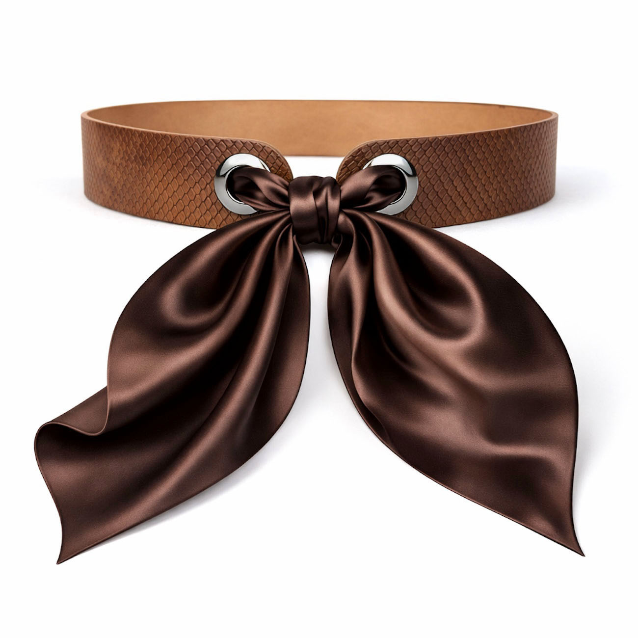 Elegantný kožený opasok viazaný šatkou je výrazný módny doplnok, ktorý dodá vášmu outfitu štýl a sofistikovanosť. Kombinácia kvalitnej kože a jemnej šatky vytvára originálny dizajn, ktorý zvýrazní pás a podčiarkne ženskú siluetu. Dominantným prvkom opasku je dekoratívne viazanie šatky cez kovové očká. Šatku môžete uviazať do výraznej mašle alebo uzla podľa vlastného štýlu. Vďaka tomu si jednoducho prispôsobíte vzhľad – od elegantného až po moderný a odvážnejší. Doplňte svoj šatník o nadčasový kúsok, ktorý spája eleganciu, kvalitu a originálny dizajn