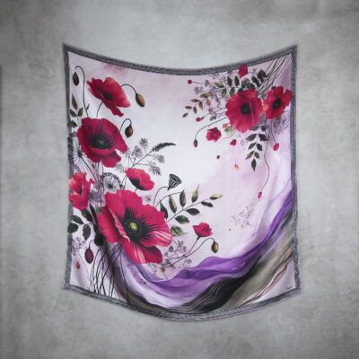 Hodvábna šatka MAK VLČÍ – FIALOVÝ, 90 x 90cm, Vyrobené na Slovensku